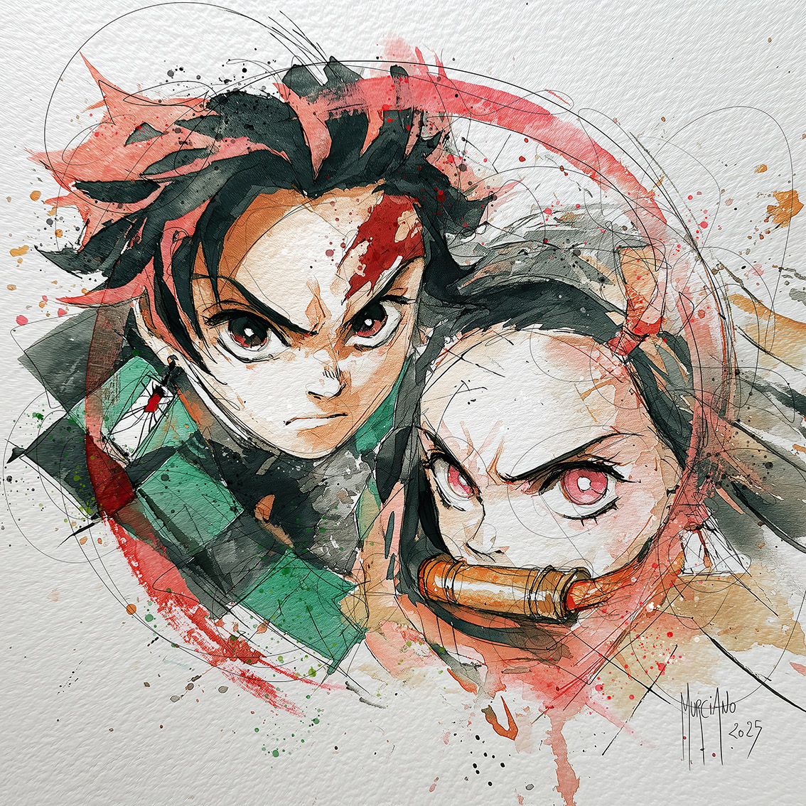 Comme dans l’ensemble de son travail, Murciano mélange pop art, street art et expressionnisme. Dans “Demon Slayers”, les contrastes et la palette chromatique confèrent au tableau une vitalité exceptionnelle. Les couleurs vives traduisent la passion et l’audace, tandis que les formes suggèrent la lutte entre ombre et lumière.