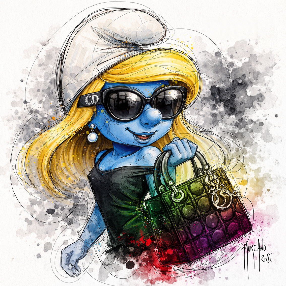 Fidèle à son style Néo-Luministe, Murciano utilise une palette de couleurs vibrantes et des projections de peinture pour donner vie à ce personnage culte. Le contraste entre le bleu caractéristique de la Schtroumpfette et les teintes éclatantes du fond crée une dynamique visuelle unique. Ce tableau n’est pas qu’une simple illustration, c’est un hommage humoristique et élégant au cinéma et à la bande dessinée.