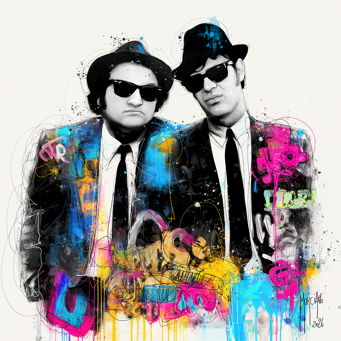 Loin du noir et blanc traditionnel associé au duo, Murciano injecte une dose massive d’énergie avec des projections de couleurs fluorescentes et des lignes dynamiques. Le contraste entre les costumes sombres, les lunettes noires mythiques et l’explosion chromatique du fond crée une profondeur visuelle qui semble faire vibrer la toile au son d’un saxophone.